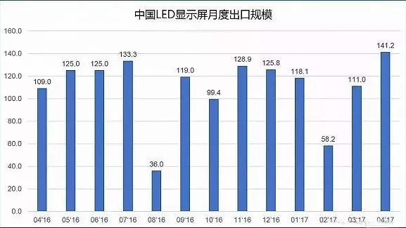 根据 最新公布的LED显示屏出口月度报告,2017年4月中国LED显示屏出口市场规模高达1.41亿美元,同比增长29.5%,环比增长27.2%,创下单月历史新高,延续一季度的良好态势,显示出海外市场需求稳步增长。