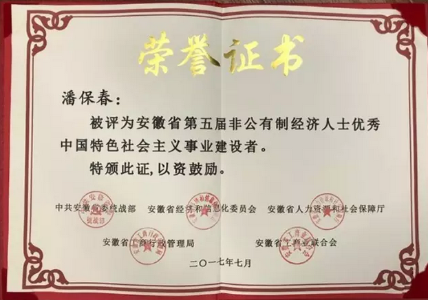 时讯丨潘保春董事长当选安徽省工商联副主席并荣获“安徽省第五届优秀中国特色社会主义事业建设者”称号