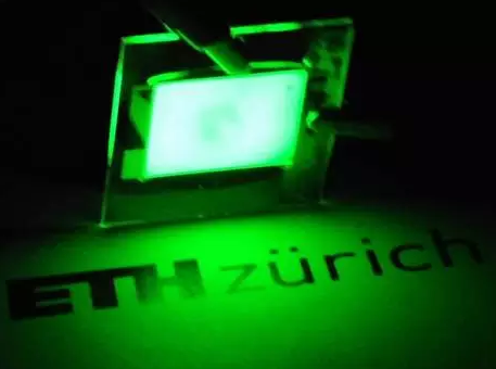 苏黎世联邦理工学院化学工程实验室科研人员最近发明了一种超薄的可弯曲的发光二极管(LED),它能发出超纯的绿光,研究人员使用这种精细色调显示了三个字母“ETH”。研究团队负责人Chih-Jen Shih教授对他的研究突破感到非常满意:“到目前为止,没有人能成功地生产出像我们这样纯净的绿光。”