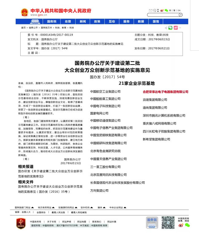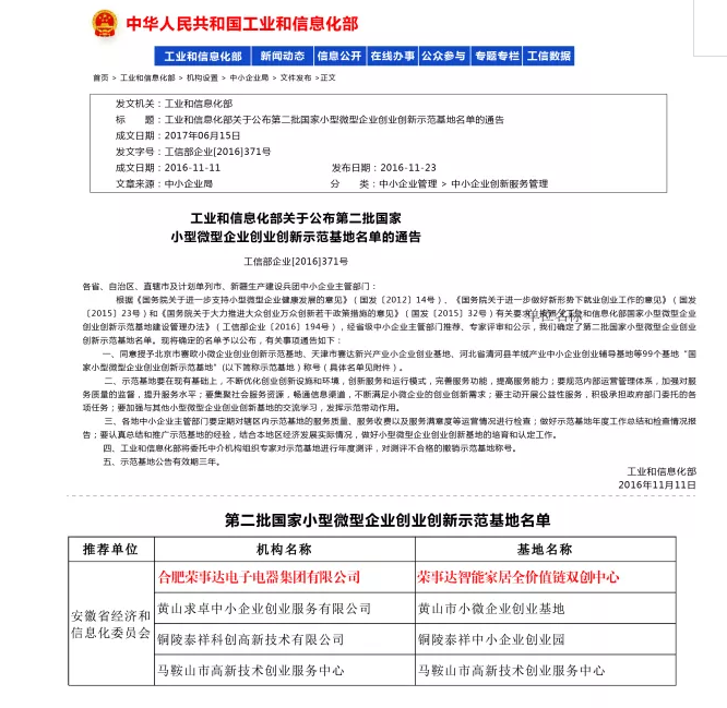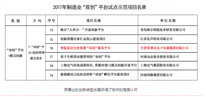 在新的历史时期,荣事达电子电器集团以机制创新推进供给侧改革、打造智能家居全价值链双创平台,先后入选工信部“国家小型微型企业创业创新示范基地”、国务院“第二批国家双创示范基地”、全国制造业“双创”试点示范企业,完成了从家电制造企业到物联网企业的产业转型、从雇佣关系到合伙人制的机制转型、从追求利润到塑造价值的价值观转型,迎来了跨越式的发展,取得了辉煌成就。