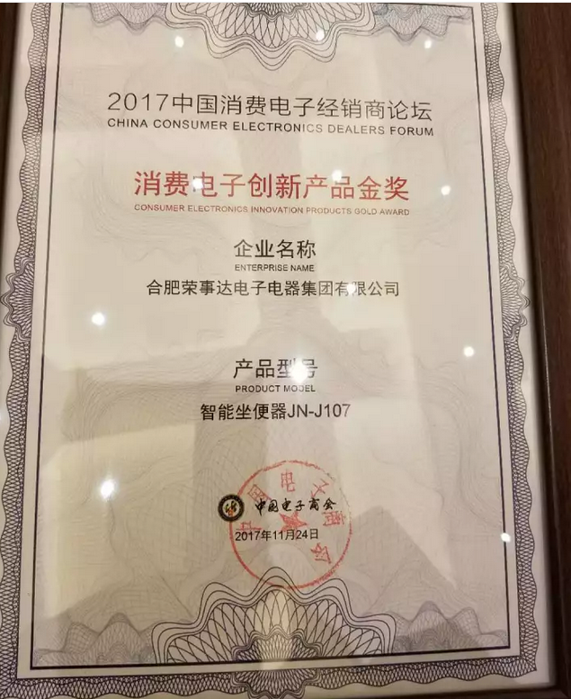 由合肥市与中国电子商会合作举办的“消费电子经销商大会暨消费电子新品发布会”也在家博会期间举行。在200多家企业的产品角逐中,荣事达智能坐便器获得本次活动颁发的“消费电子产品创新金奖”。在此感谢主办方能够提供此次平台,赋予荣事达这项光荣的奖项。