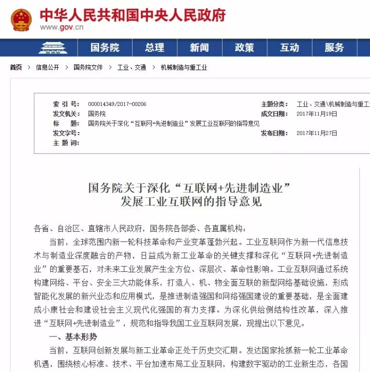 而国务院近期印发的《关于深化“互联网+先进制造业”发展工业互联网的指导意见》(以下简称《意见》)中也指出,围绕推动互联网和实体经济深度融合,聚焦发展智能、绿色的先进制造业,构建网络、平台、安全三大功能体系,持续提升我国工业互联网发展水平,深入推进“互联网+”,形成实体经济与网络相互促进、同步提升的良好格局,有力推动现代化经济体系建设。