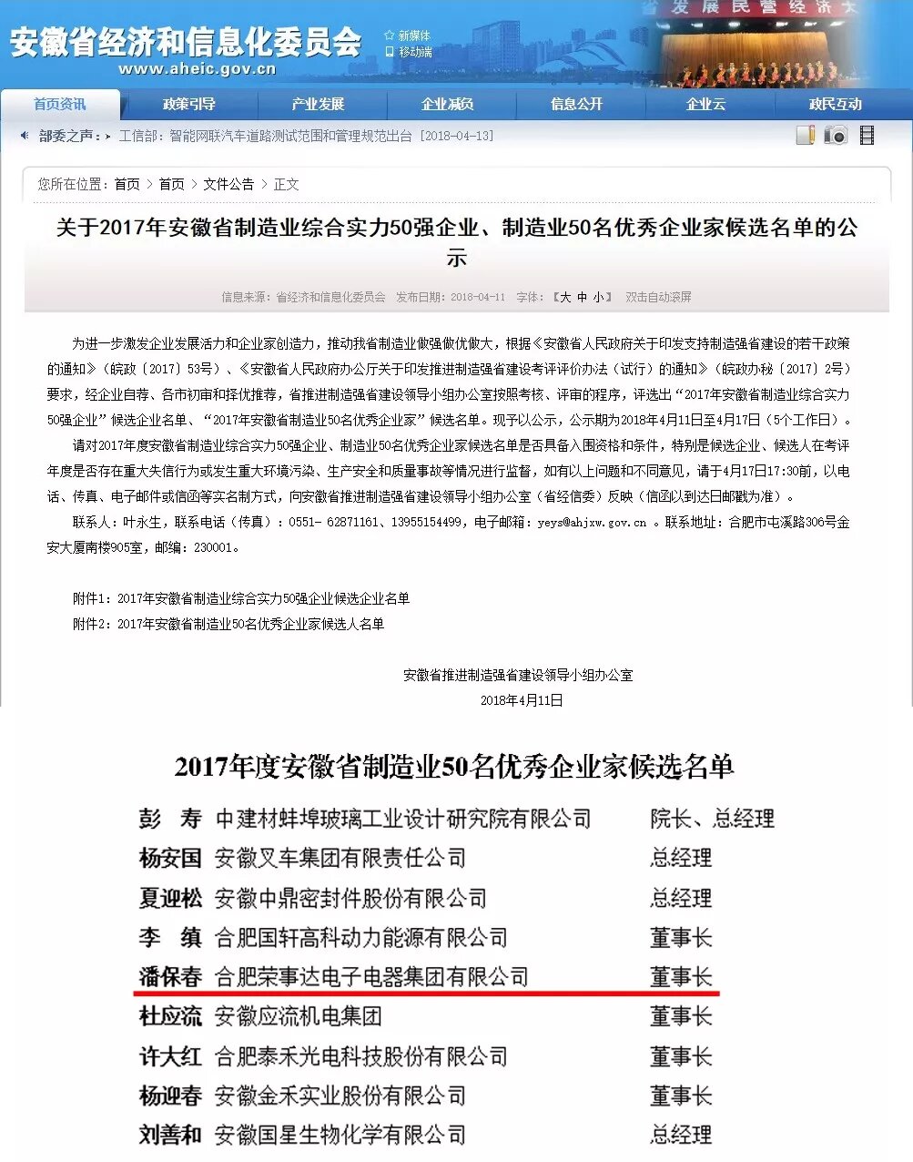 日前,安徽省经信委公示了2017年安徽省制造业综合实力50强企业、制造业50名优秀企业家候选名单。第十三届全国人大代表、中国青年企业家协会副会长、安徽省工商联副主席、合肥荣事达电子电器集团董事长潘保春荣耀入选2017年安徽省制造业50名优秀企业家候选人公示名单,并顺利通过公示。