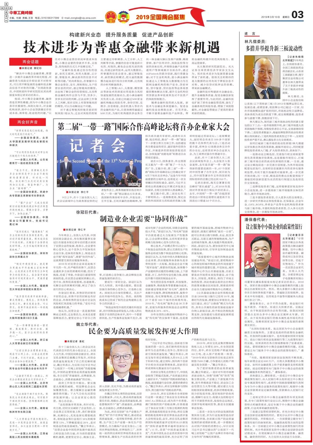 3月10日,中华工商时报就潘保春董事长《关于设立服务于中小微企业政策性银行的建议》进行了专访报道。