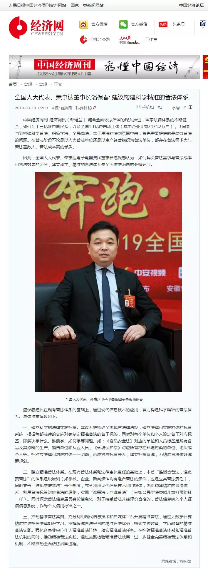 在3月10日,人民日报中国经济周刊官方网站《经济网》的报道中,潘保春董事长就“如何解决普法需求与普法成本和普法效果的矛盾”发表了自己的看法,他认为:建立科学、精准的普法体系是全面依法治国的关键环节。他建议:在现有普法体系的基础上,通过现代信息技术的应用,着力构建科学精准的普法体系。