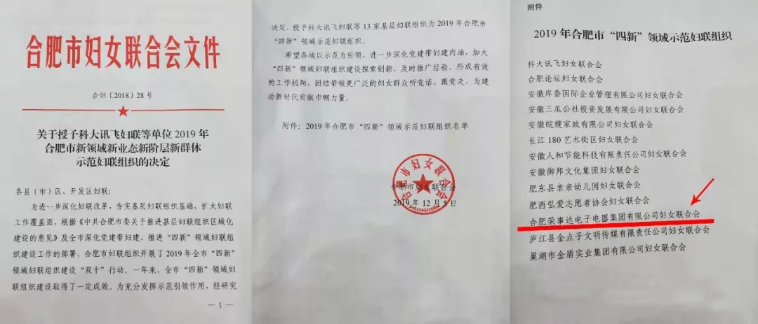 会议期间,2019年合肥市“四新”领域示范妇联组织名单公布。合肥荣事达电子电器集团有限公司妇女联合会荣誉当选。