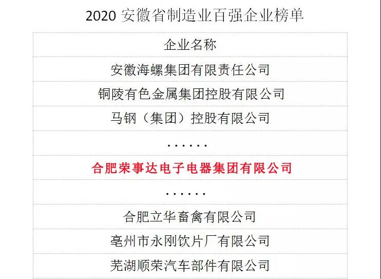 荣事达电子电器集团将以此次荣获三大百强企业为动力,继续秉持“感恩、守正、创新”的企业核心价值观,在创新创造上积极突破、在做优做强上努力提升、在履责担当上有新作为,展现新时代安徽民营企业的担当与风采,为五大发展美好安徽建设作出积极贡献!