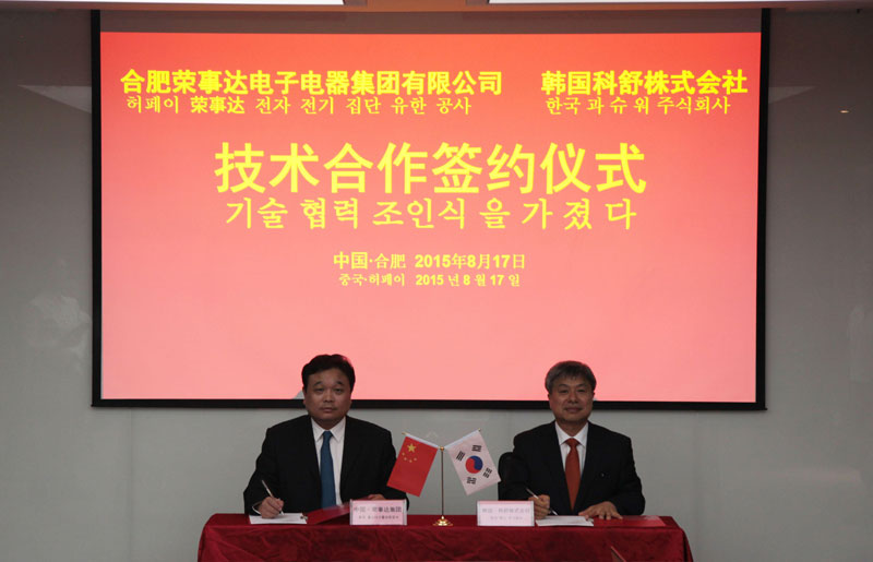 17号下午14:30,韩国科舒株式会社社长丰弼元、常务李春山与荣事达电子电器集团董事长潘保春、常务副总裁马睿、荣事达电子电器集团有限公司总经理张丽苹准时出席签约仪式。董事长潘保春代表公司对韩国合作伙伴的到来表示最热烈的欢迎。