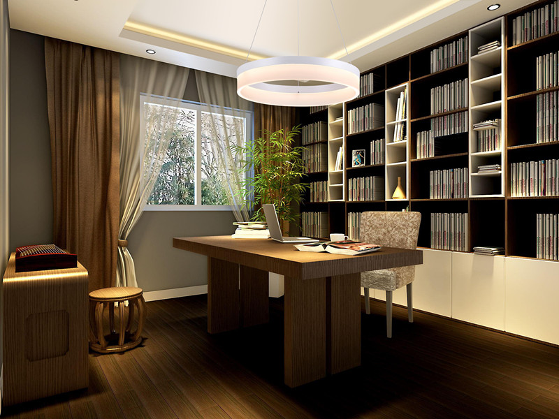 书房有明显的功能倾向,一般来说,以雅致幽静的气氛为佳。因此,在这种功能至上的环境中,灯的形式一定不能成为空间的主角,也就是说,书房照明布置的原则是以满足照度要求为准。除了传统的台灯外,还可考虑在书桌的上方安装一盏向下聚光的吊灯,灯的风格可多样化,中式、欧式或现代均可,但造型上应尽量简洁,并且灯罩的开口应该向下,形成局部聚光,不仅能满足阅读或工作的照明需要,也能形成空间的明暗虚实。