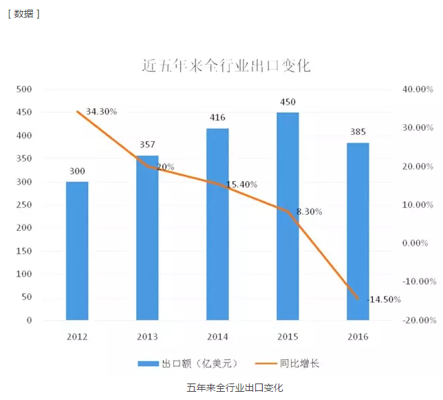 自2009年以来,行业出口首次出现负增长现象2016年,照明行业累计出口额为384.6亿美元,相对去年同比下降了14.5%。其中电光源产品出口43.5亿美元,与2015年同比减少了13.2%;照明灯具出口额297.4亿美元,与2015年同期下降15.6%。出口数量增加而出口金额减少照明产品出口不仅表现在金额下降,从海关数据的反馈: