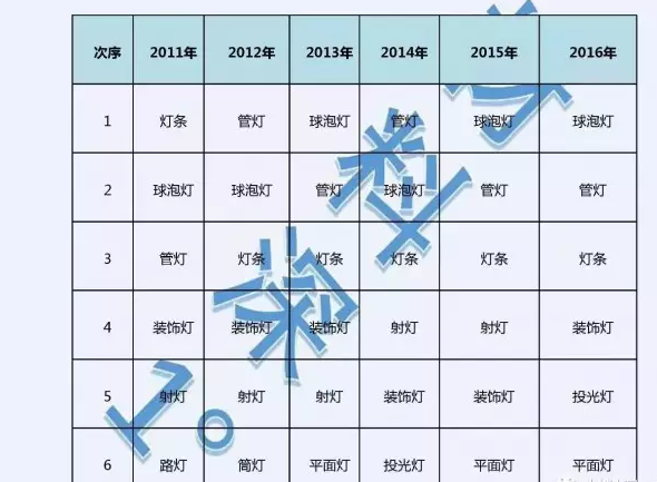 从近几年各类产品的出口金额排序来看,球泡灯、管灯和灯条一直占据前三甲,2016年出口品类结构变化较小。