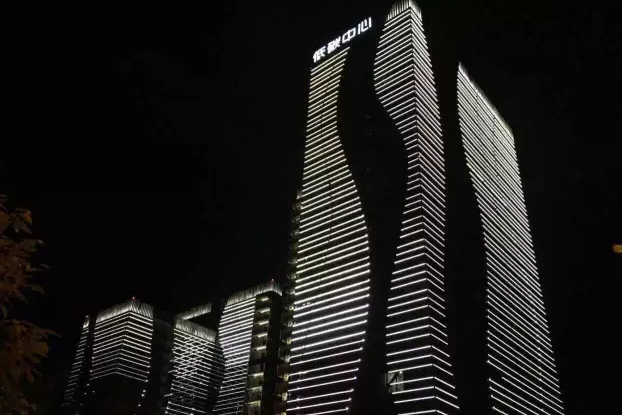 高亮节能、防眩光的 LED 视频灯更体现了大楼低炭、绿色环保的主旨理念。另一方面,低碳中心建筑底座采用的香槟色灯光,与建筑群周围街道上昏黄的路灯相呼应,同时又是一个巧妙的过渡,这种介于白色与昏黄色之间的颜色,使得低碳中心既不会在街景中显得太突兀,而街景却因为有了低碳中心的灯光而增色不少。