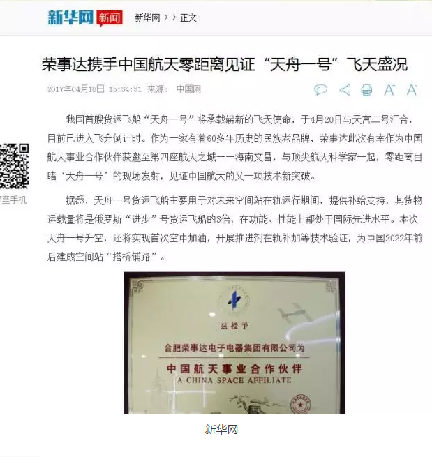 诚如潘保春董事长所说的那样,“特别能吃苦、特别能战斗、特别能攻关、特别能奉献”的航天精神,早已铭刻在每一位荣事达人的心灵深处。荣事达电子电器集团董事长助理、品冠之家事业部总经理刘树栋自豪地说:“与中国航天达成战略合作伙伴关系以来,航天精神已逐渐融入到荣事达的企业文化之中,让荣事达更加有信心面对未来的挑战。‘天舟一号’已经成功进入外太空!荣事达人的骄傲和自豪也将直冲九霄! ”