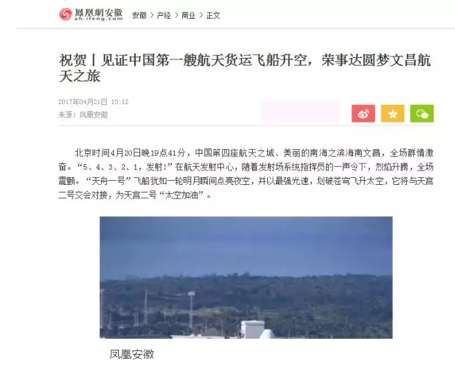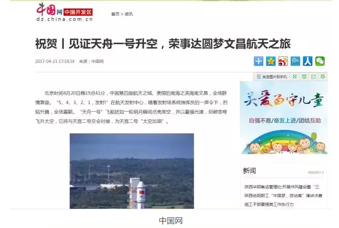 北京时间4月20日晚19点41分,“天舟一号”飞船在海南文昌卫星发射中心成功发射。作为中国航天事业合作伙伴,全国双创典范、民族老品牌,荣事达电子电器集团受邀亲临航天发射基地,现场观摩“天舟一号”飞升。社会各界媒体对此次荣事达“天舟一号”助力团文昌航天之旅给予了充分的关注。